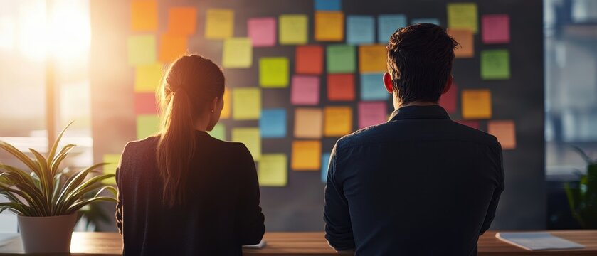 Team collaboration and planning with sticky notes in office