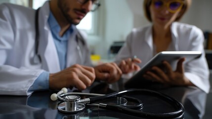 Scientific Collaboration: Focused medical professionals huddle over a digital tablet, immersed in concentrated study, emphasizing collaboration and expertise.