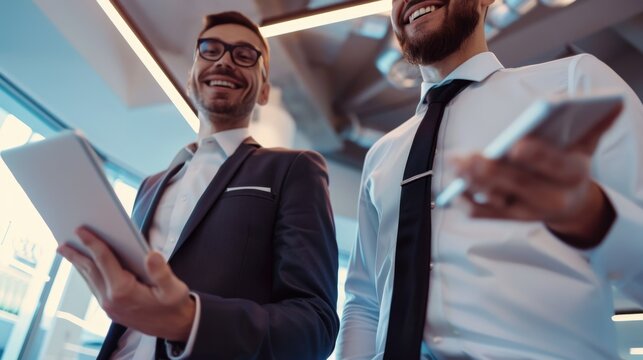 Joyful colleagues sharing a laugh over a tablet in a modern office meeting room