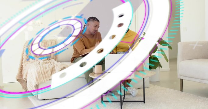 Collaborating friends leaning toward laptop in home living room, with digital interface overlays