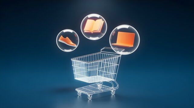 An abstract background depicting a neon glow online shopping cart with 50% off, accompanied by digital product icons and a futuristic tech theme. Generative AI