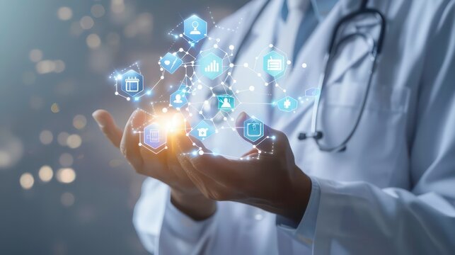 Low polygon Doctor hand with stethoscope and Ui icon medical in hospital with medical technology network concept. generative ai.