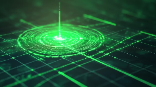 Futuristic control panel with a glowing green circular ui and holographic data visualizations, conveying advanced technology, cyber security, ai analytics and network monitoring