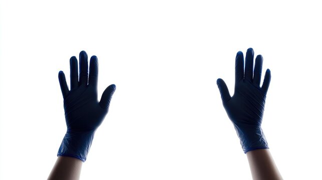 Close up of gloved hands raised against white background for medical or health care related concepts and empty space for text