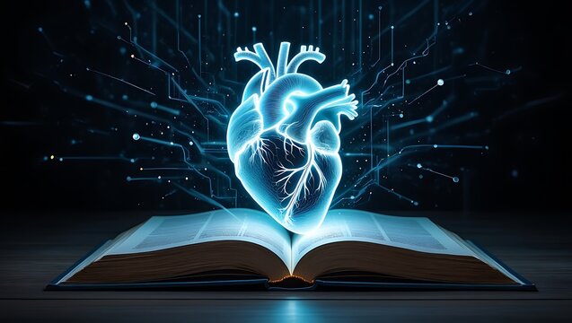 Digital heart over open book medical technology and research concept