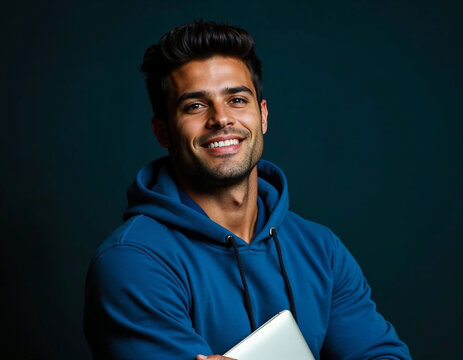 A smiling man in modern office setting, surrounded by computer monitors displaying code. atmosphere is bright and professional, reflecting tech savvy environment