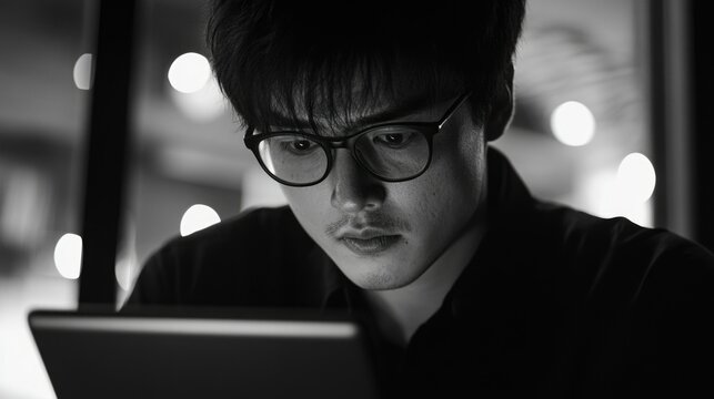 Office worker using mobile phone in modern workplace. Concentrated businessman checking email on smartphone during work hours. Professional in business attire interacting with digital device.