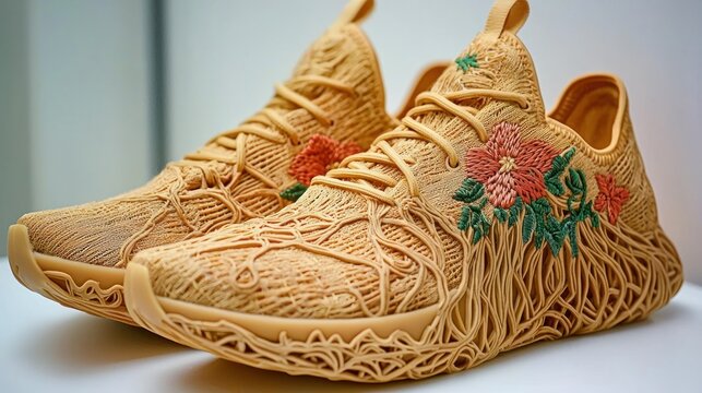 Beige 3D-printed sneakers with floral embroidery.