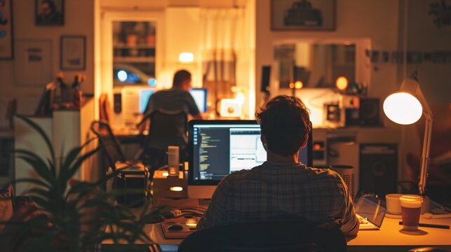 A team working late into the night in a dimly lit tech startup office