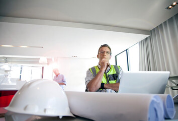 Construction and engineer structure concept of engineer working drawing on blueprint meeting for project working with partner on model building and engineering tools in working site