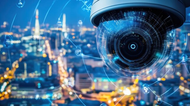 Cybersecurity alerts over urban waterfront with cctv surveillance