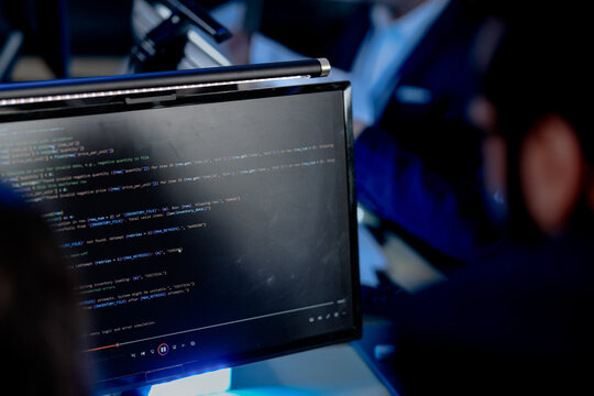 Deep code focus. Developers working late debugging software script visible on screen collaborative coding session in progress intense tech teamwork dev life revealed.