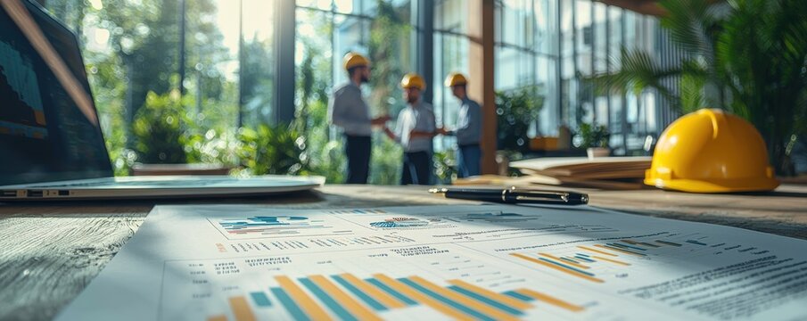 Close-up of business documents with graphs on a table in a modern office environment with construction workers