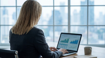 Businesswoman analyzing financial charts on laptop in modern office with city skyline view through large panoramic windows