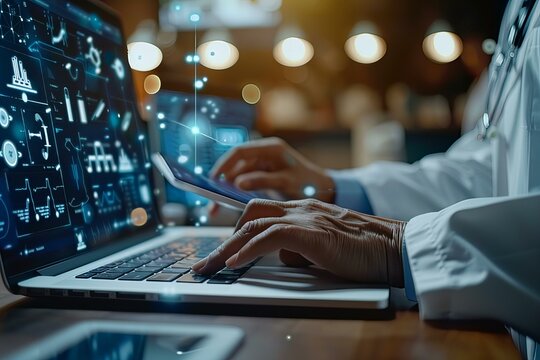Technology with Wealth concept. High-tech workspace with a laptop displaying data analytics in vibrant colors.