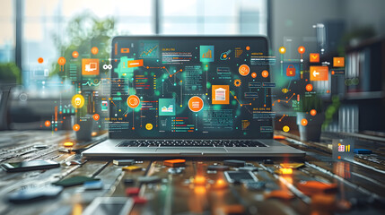 Laptop screen showing vibrant and complex data analysis graphs in a modern office setting, emphasizing analytics and technology