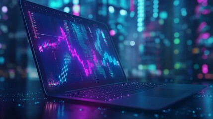 Laptop Displays Stock Market Data In Neon Lit Workspace