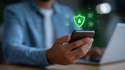 Hand pointing to digital data protection interface on laptop screen, with secure shield icon and network diagram. Concept for cybersecurity, cloud storage, and secure data access.