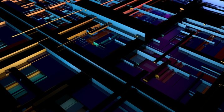 Vivid led pixel grid showing neon bokeh, circuit traces and multicolor abstract macro