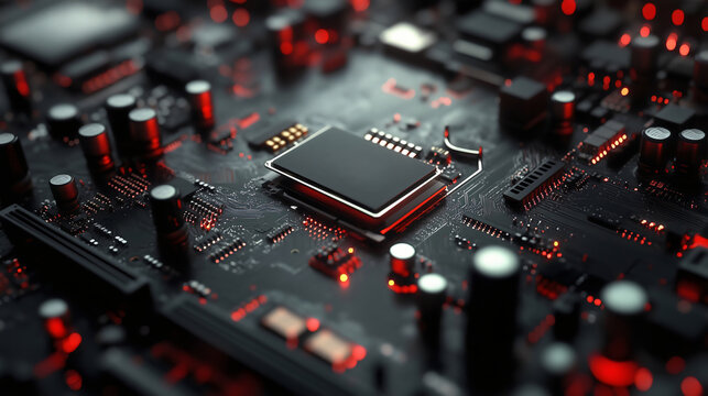 CPU processor on a motherboard, hardware components in computer technology, an intricate electronic setup with digital chip and circuit closeup reflecting advanced tech systems