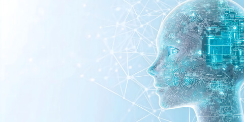 Blue cyan glowing AI artificial intelligence chip on circuit board representing advanced machine learning neural network technology and quantum computing concept