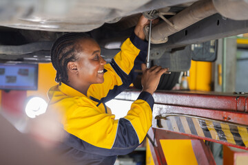 Small business garage, mechanic, African female engineer handling car exhaust repair confidently, technical performance shines in automotive uniform with strong leadership engineering task in workshop