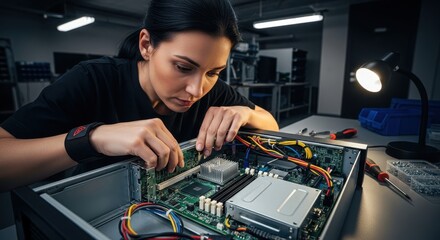 Skilled woman engineer assembling a custom PC, focusing on the motherboard installation.