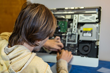 Rear view of young male engineer in a hoodie busy, and focused in fixing and assembling parts of a fancy desktop computer in modern office