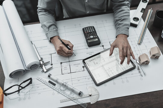 Architecture Engineer Teamwork Meeting, Drawing and working for architectural project and engineering tools on workplace, concept of worksite on technical drawing structure and construction