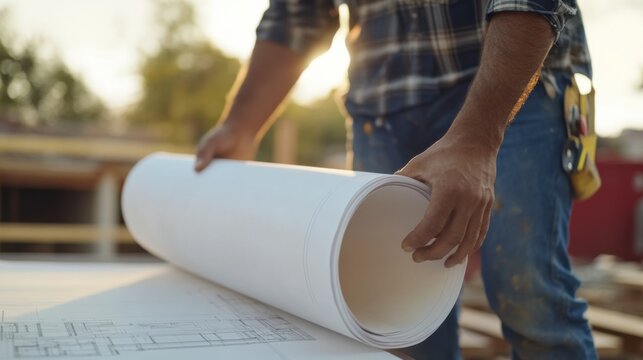 A Hispanic construction worker preparing a blueprint at a construction site. Featuring focus and technical skill