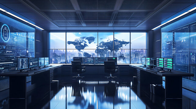 Control office room full of monitors on the table or desk with world map on the large display screen on the wall. Network surveillance, monitoring center, technical support, logistics,server station