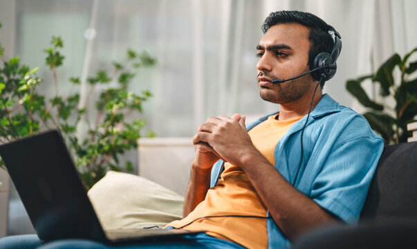 Serious Young Caucasian Man with Headset, Successful Manager of Call Center Sits in Office, Uses Computer, Talking on Video Conference with Client or Employee. Helpline Concept