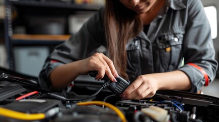 A woman using a diagnostic tool to troubleshoot and repair a car's electrical system, demonstrating technical proficiency with minimalist style