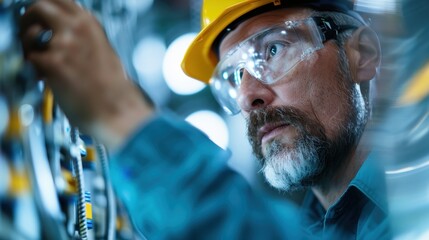 A worker in protective clothing and a yellow hard hat is focused on fixing mechanical equipment in an industrial setting, representing diligence and technical skill.