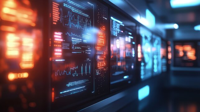 Futuristic control room wall displays various bright orange and blue technical readouts and data streams.