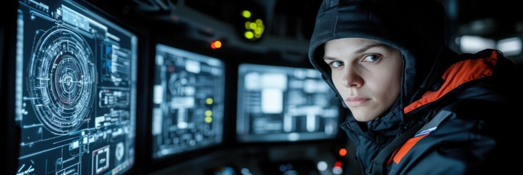 Young operator monitors advanced control screens in a high tech facility at night