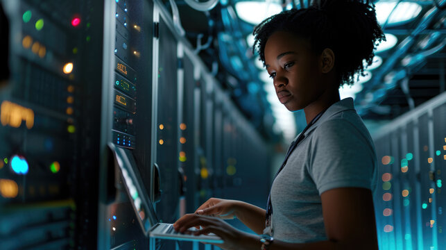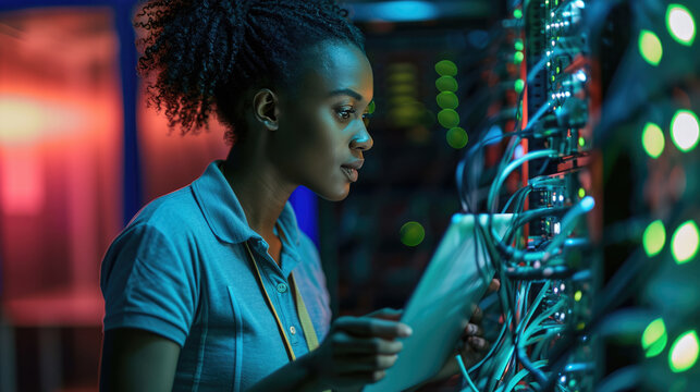 Specialist maintenancing server room responsible with intense data computations demanding high capacity, scalable, error free network to effectively support artificial intelligence machine learning