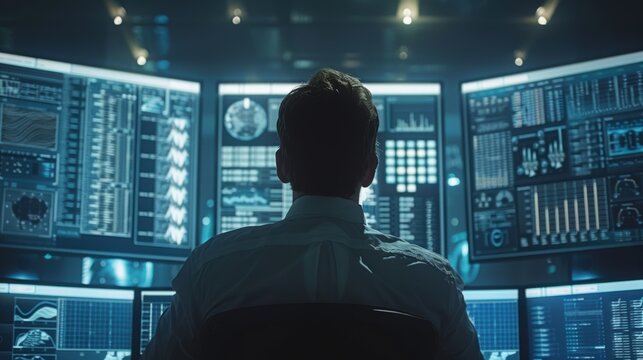 The programmer is at work. Coding. A man wearing headphones is sitting in front of two computer monitors. He is focused on his work and analyzes the data