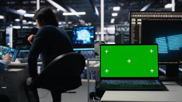 Close up of engineer on data center industrial platform analyzing performance outputs on green screen laptop. Server room IT expert finetuning server rig configurations using mockup notebook