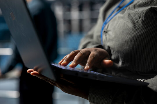 Close up of system administrator in data center analyzing infrastructure performance outputs on laptop. Server farm worker doing job tasks, finetuning supercomputers configurations