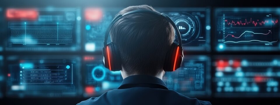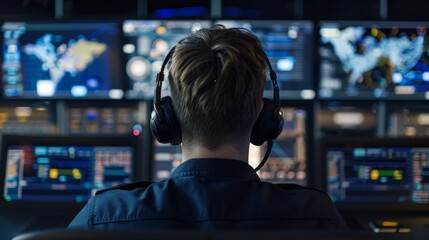 Man Monitors Complex Data on Multiple Screens in Futuristic Command Center Setup