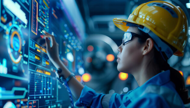In a modern facility, a technician meticulously engages with a 3D holographic display, illustrating the interface between man and machine in the contemporary industrial landscape.