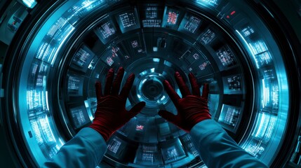 Scientific Exploration in High-Tech Laboratory with Glowing Equipment and Red-Gloved Hands Engaging with Futuristic Data Displays
