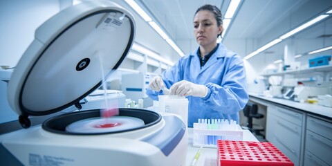 A close-up view of a centrifuge in motion inside a medical laboratory, with a technician preparing samples for testing. The lab features advanced equipment and neatly organized workstations.