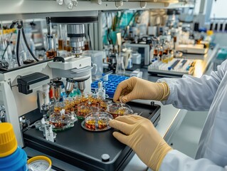 Closeup of a scientist s hands handling a microplate, preparing samples for testing in a biological lab