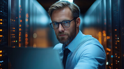System administrator works in server room, managing network security and data processing systems, artificial intelligence technology.