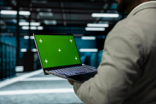 Close up of data center technician using green screen laptop, managing rigs energy consumption. IT specialist using mockup notebook used for monitoring processes in server room