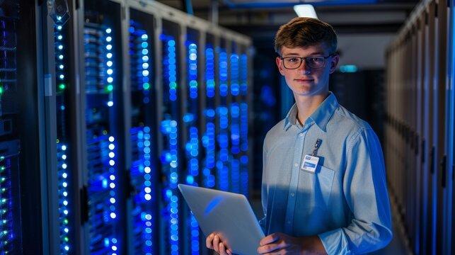 Black IT Technician with a Laptop Computer Gives a Tour to a Young Intern. They Talk in Data Center while Walking Next to Server Racks. Running Diagnostics or Doing Maintenance Work.