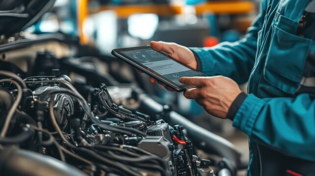 Technician uses augmented reality diagnostics software on tablet to inspect engine bay for broken components. The integration of advanced technology in automotive repair, diagnostics