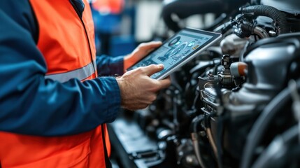 Technician using AR diagnostics tablet: Augmented reality tools assisting with real-time engine inspections and repairs
